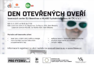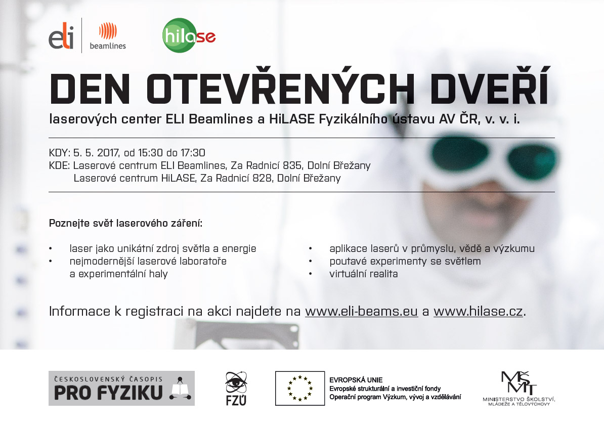 Laserová centra ELI Beamlines a HiLASE pořádají 5. května 2017 další společný Den otevřených dveří. Srdečně zveme k návštěvě zájemce všech věkových kategorií!