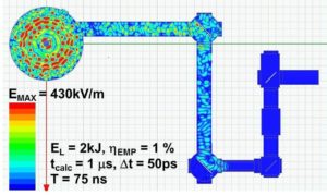 Figure 2 ((a) Detailed structural model used for an EMP propagation simulation. (b) Electric field snapshot at a time of 75 ns in the central horizontal plane of a vacuum system.