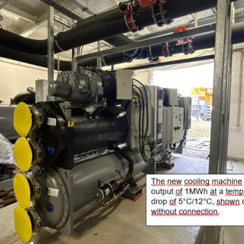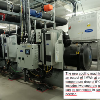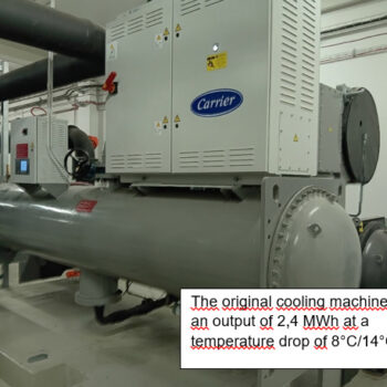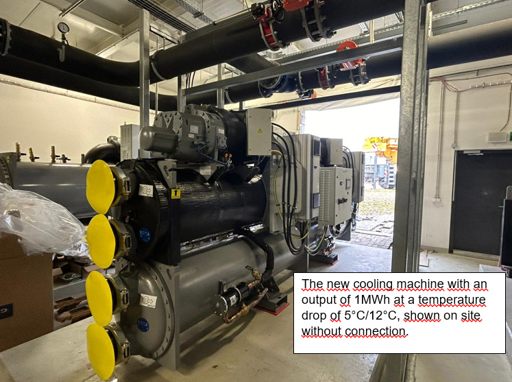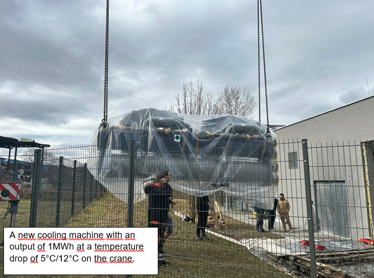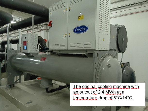The original cooling system supplied cooling water at temperatures of 8-10 °C, while the new machine can achieve temperatures as low as 5 °C. The new cooling system features smoother regulation and is technically two machines combined into one, allowing it to operate economically, even at partial capacity.